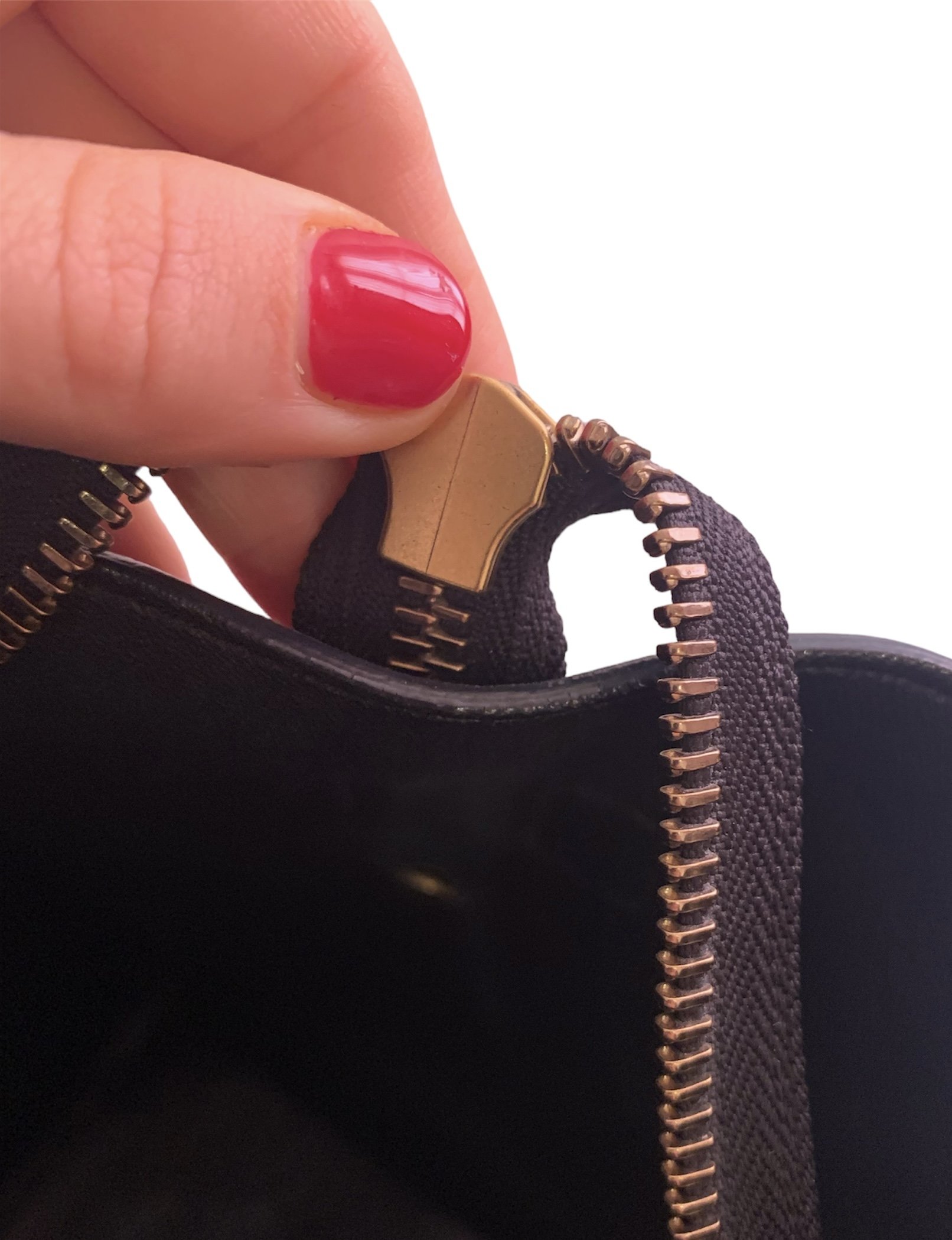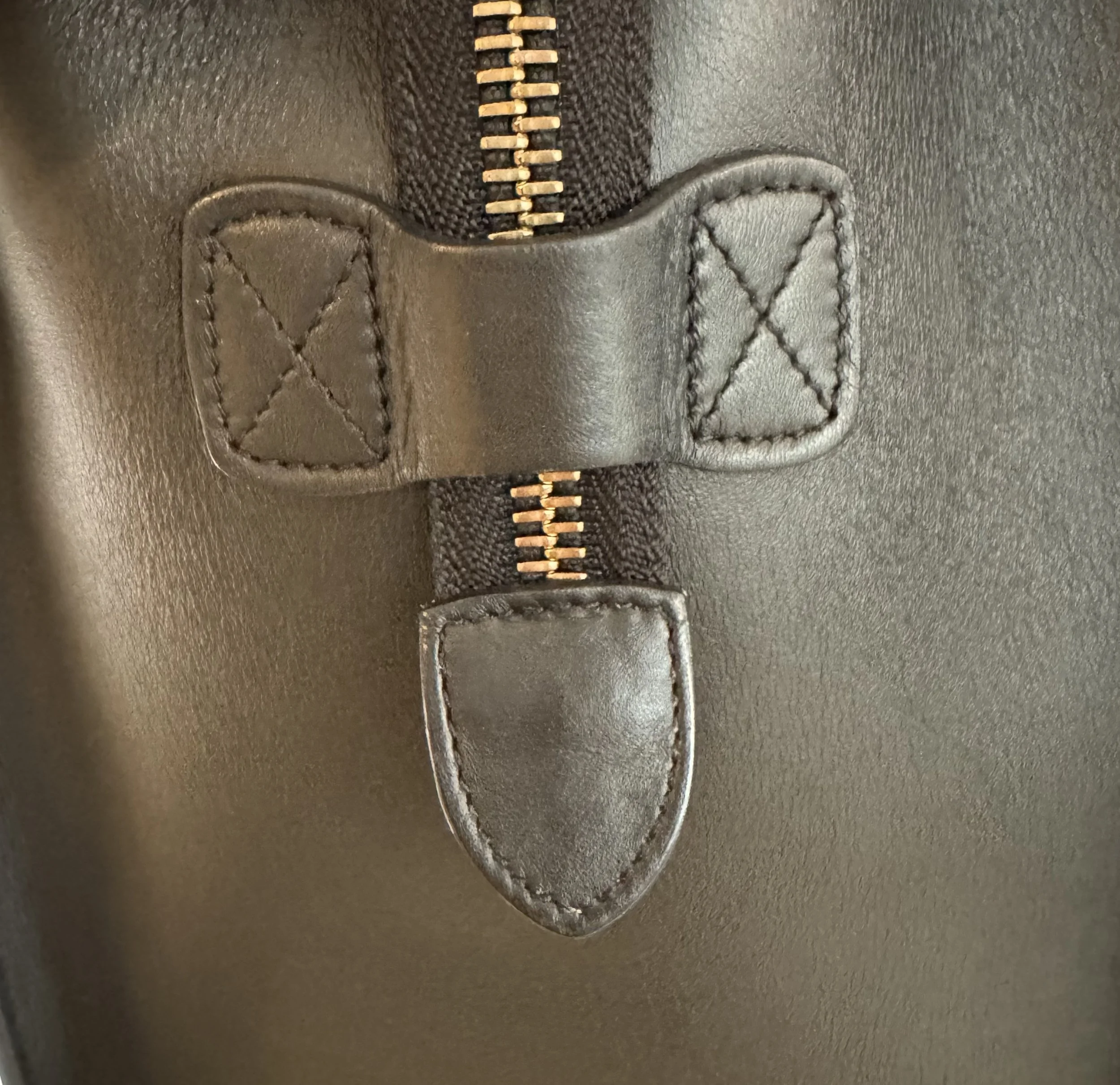 Note: a really good easy spot of a counterfeit: The piece of leather which covers the bottom stop of the zip cannot be pulled through the fixed leather loop. (if you really, really forced it, and bent the leather - you could probably do it just* but probably with damage, I tried to pull it through and couldn’t) On fakes the leather is bad quality - and you could pull it through with ease.