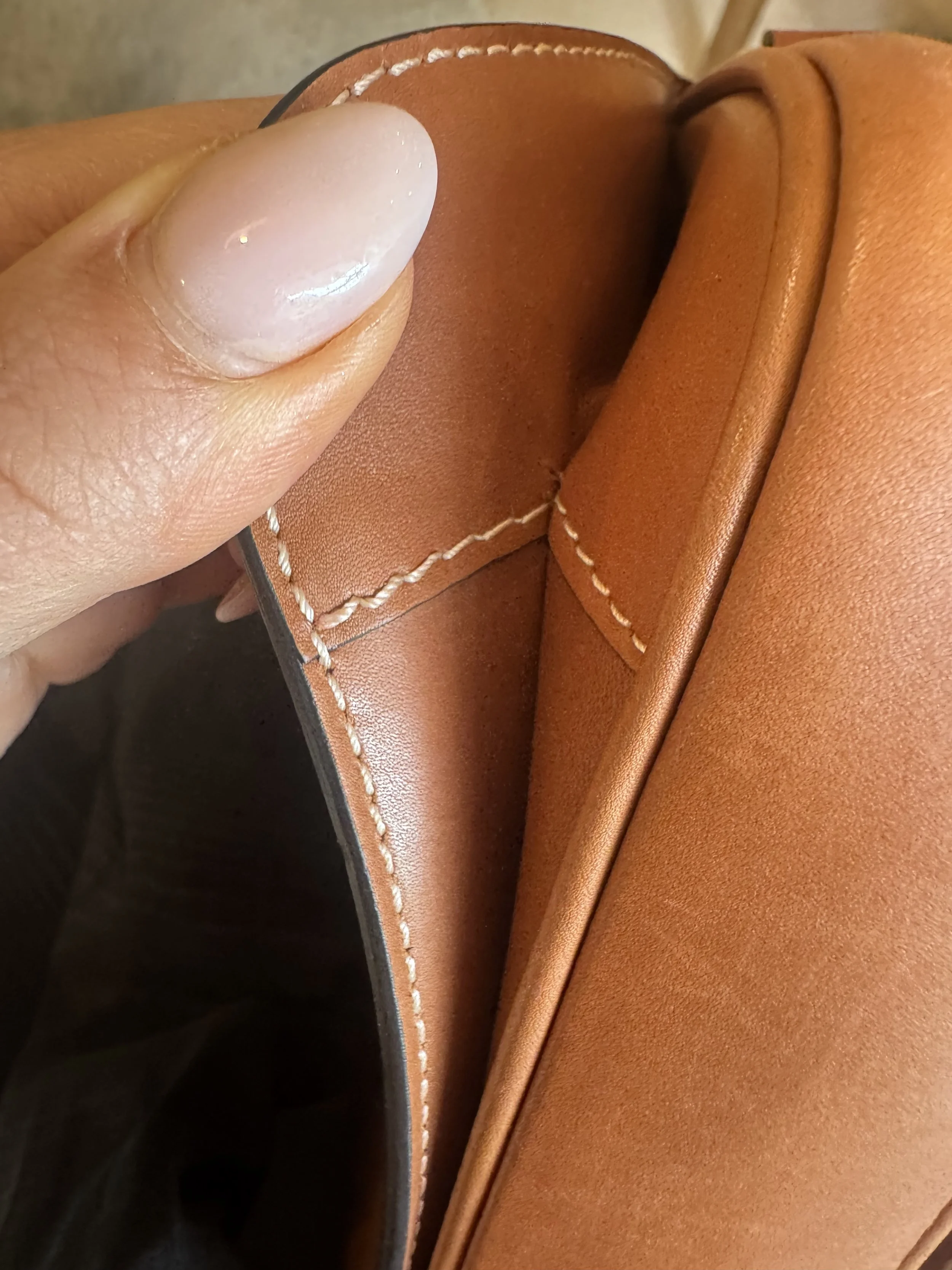The stitches you need to pay close attention to are the stitches which bring multiple pieces of the leather together. Due to the leather being such good quality it needs a hefty stitch in place to bring everything together. This single stitch overlaps 4 times. (give or take). The interior stitches are brown and the outer are cream.