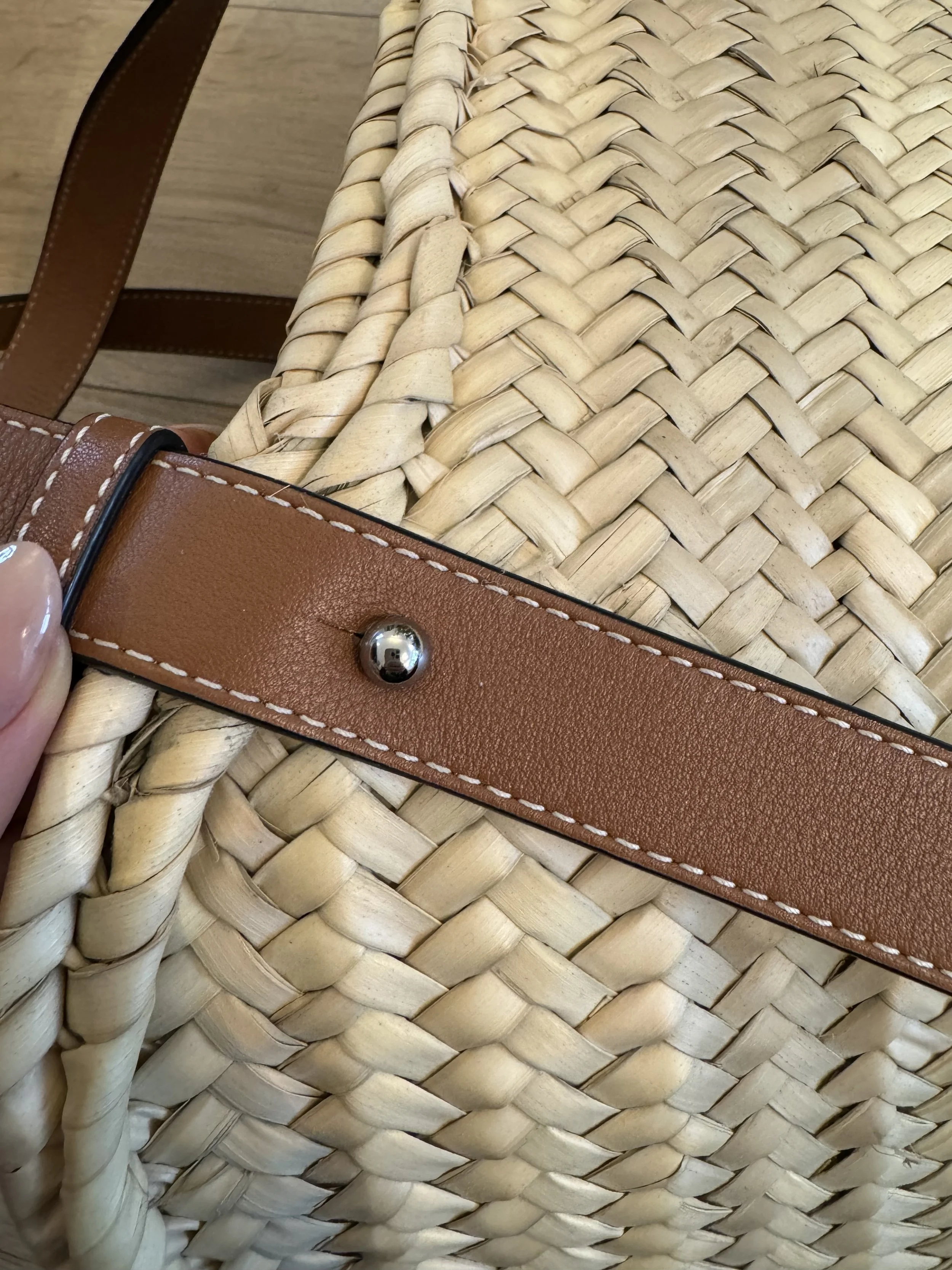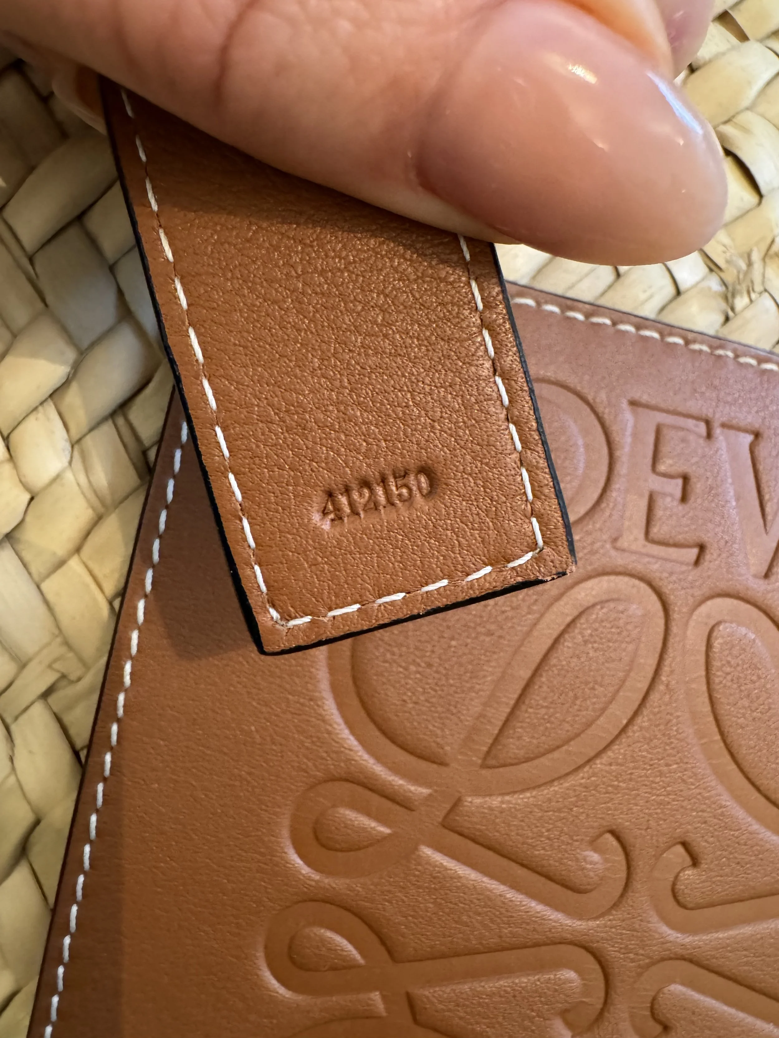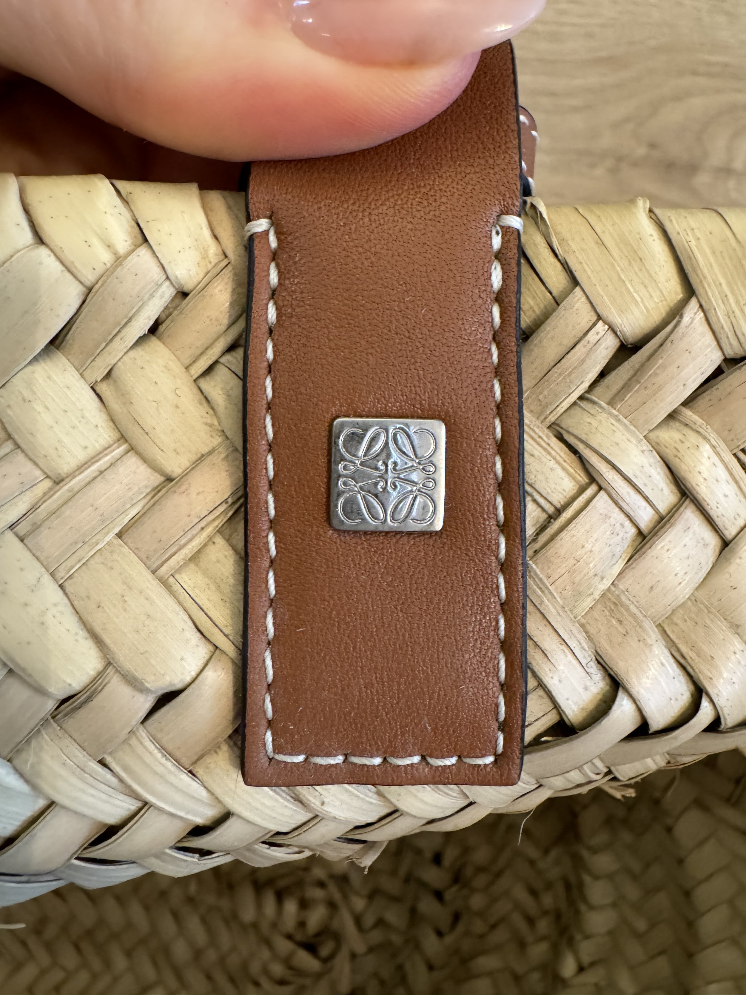 -If it sits up straight and on its own this is a good indicator of an authentic bag. If it is wonky, sits unevenly, or keeps falling over it is very, very likely fake. This is because the base of a weave bag is hard to craft. Loewe have exceptional artisan crafters who weave these bags by hand from palm leaves. They get it right and create a flat base.