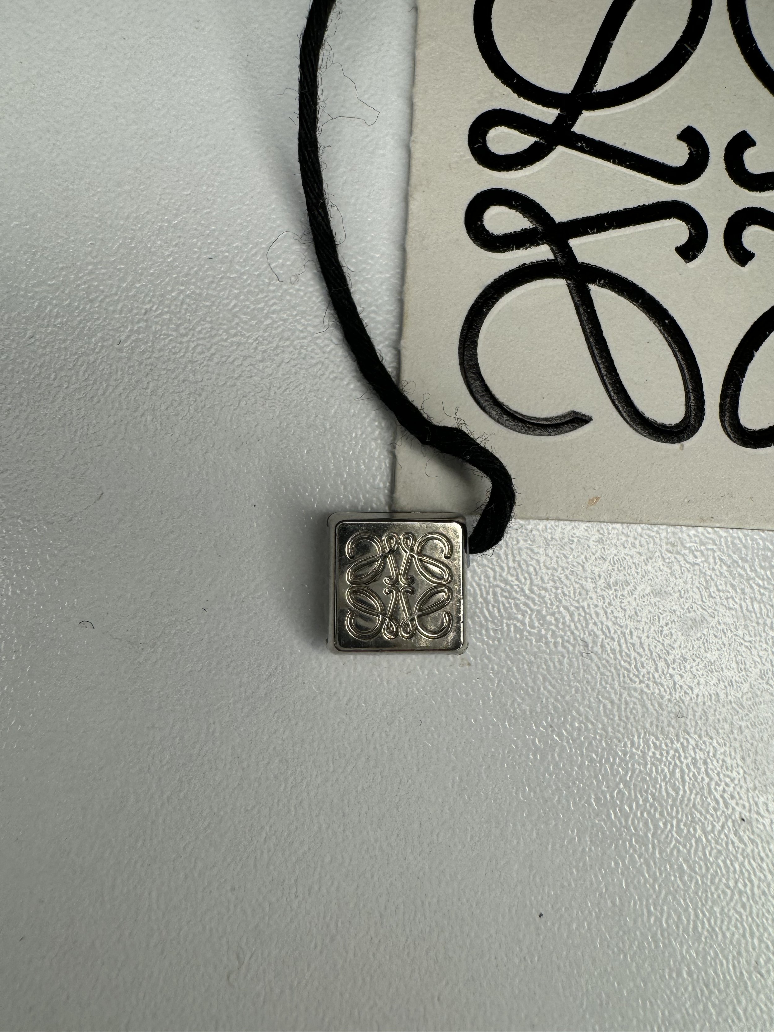 The tag is attached to the bag with black string and a small silver toned embossed square bearing the Loewe logo.