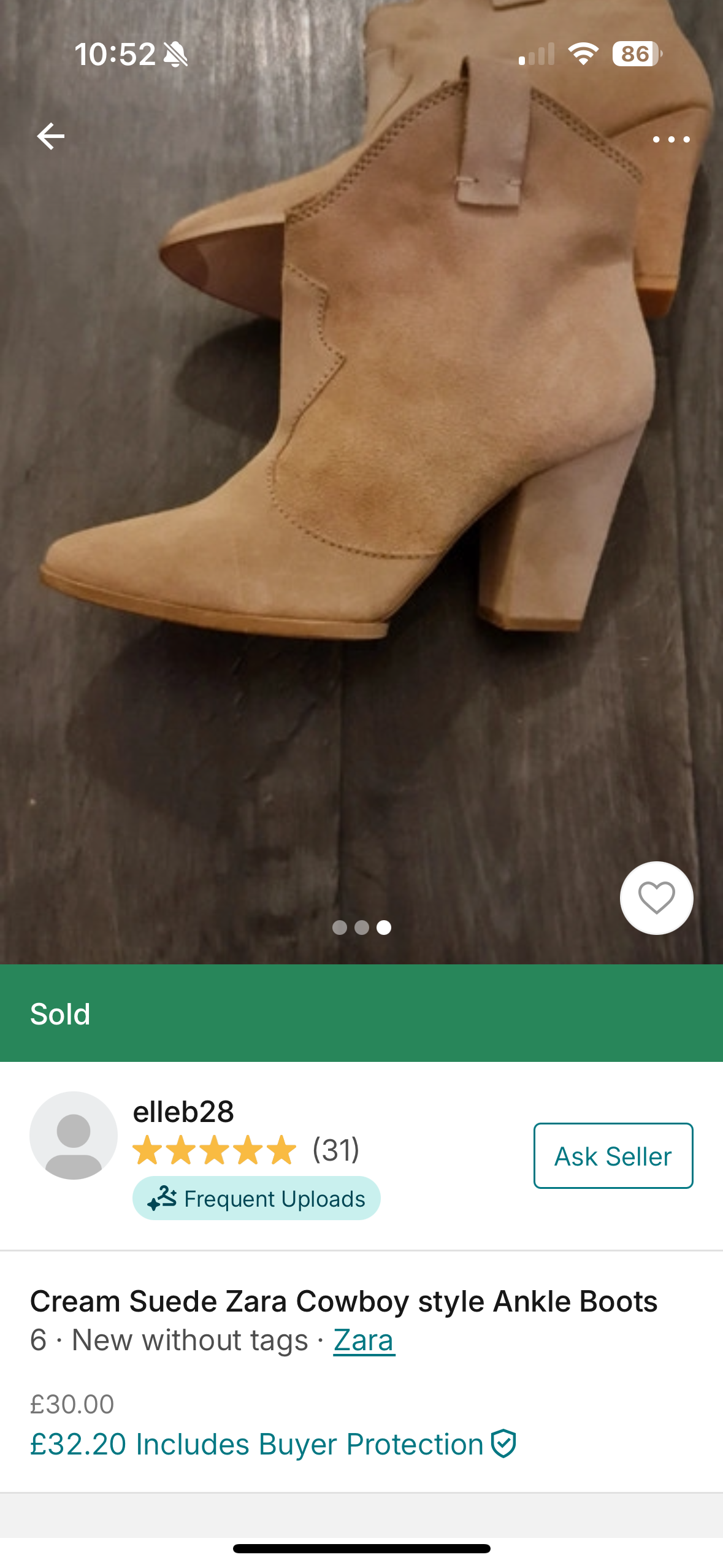 Pair 5: Vinted £28.39 // RRP Zara (unsure but real suede so likely £54-64.99) Cream Suede Zara Cowboy Style Ankle Boot