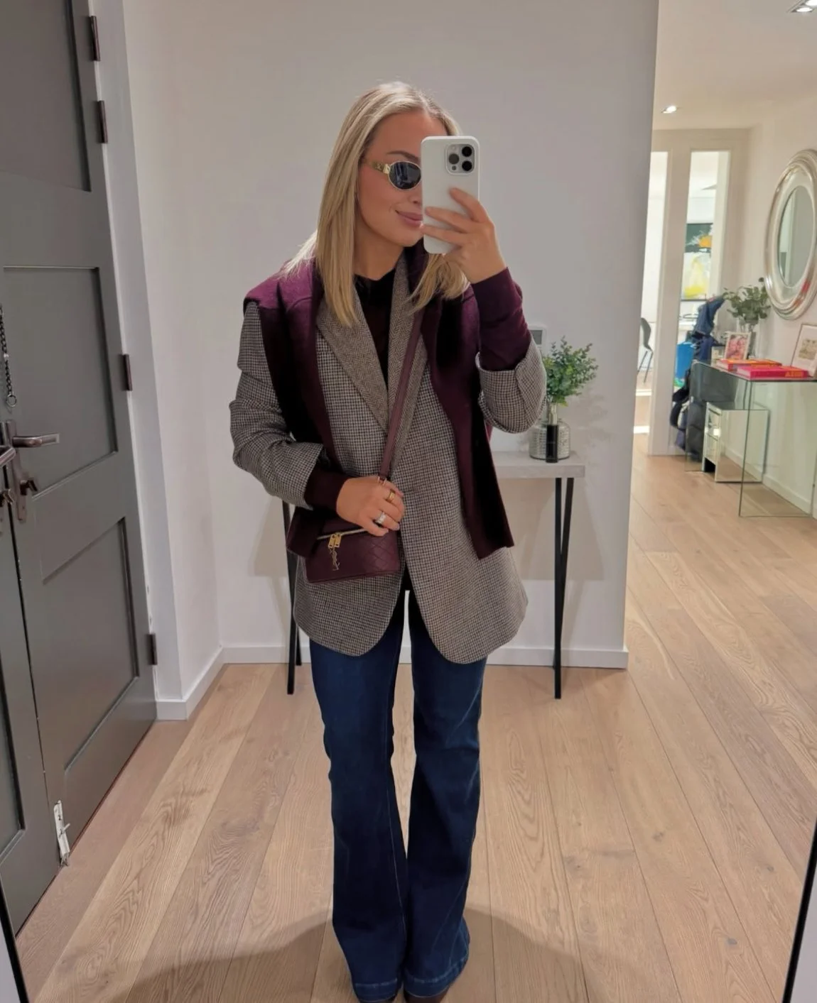 This is such a cute bag, and just giving all the autumn vibes. Alice has worn it with her checked blazer and flared jeans. It’s the perfect autumnal bag: structured, rich in tone, and just the right size to pop out for a coffee with friends. It adds that pop of understated luxury to an otherwise classic outfit. (also love those Celine shades)